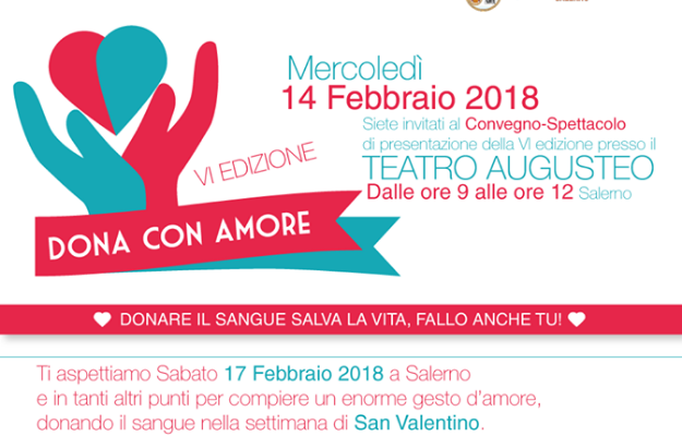 Tutto pronto per l’evento di promozione sociale, dedicato alla sensibilizzazione, donazione del sangue e all’integrazione socio-culturale  intitolato “Dona con Amore”, la giornata giunta alla sua VI edizione che si svolgerà sabato 17 febbraio presso il reparto Immuno-Trasfusionale dell’Azienda Ospedaliera Universitaria San Giovanni di Dio Ruggì d’Aragona di Salerno dalle ore 08.00 alle ore 13.00 ed in tanti altri Centri Ospedalieri dislocati sulla provincia di Salerno.