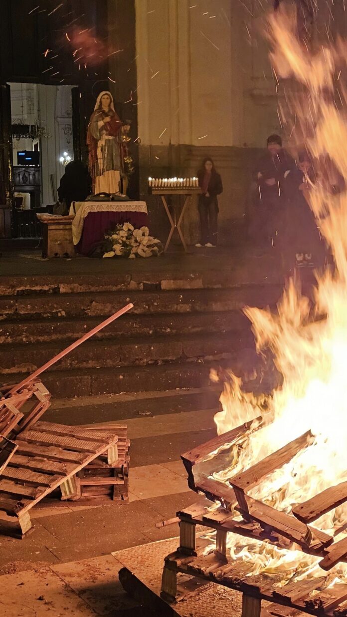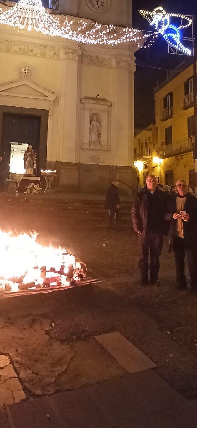 Il caldo focolare è stato acceso al centro della Piazza del Santissimo Corpo di Cristo antistante alla chiesa omonima intorno alle ore 20 mentre sul sagrato è presente la statua dedicata a Santa Lucia. Gli operatori sono intenti ad alimentare la “focarina” increspata dal vento, i presenti sono estasiati e meditativi a contemplarla, don Flaviano Calenda, parroco della chiesa madre di Pagani, commenta con gioia la rinnovata presenza della luce che porta con sé Santa Lucia, protettrice di chi ha perso la luce, dei ciechi.