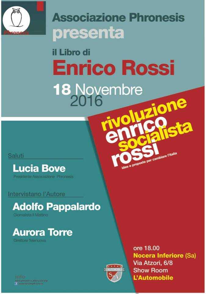 Il Presidente della Regione Toscana, Enrico Rossi, venerdì 18 Novembre alle ore 18.00 a Nocera Inferiore. Il Governatore della Toscana sarà ospite dell’ Associazione Phronesis presso lo Show Room l’Automobile in via Atzori 6/8, per la presentazione del suo libro “Rivoluzione Socialista, idee e proposte per cambiare l’Itala”.
