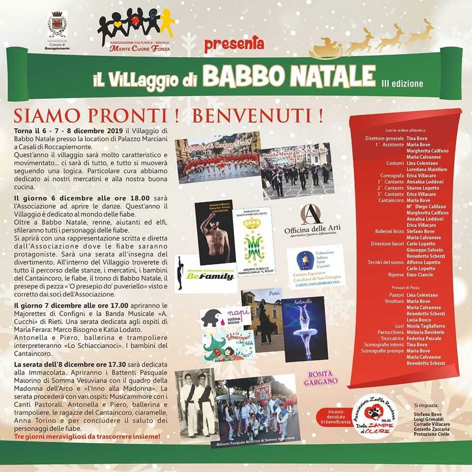 Con l’apertura del Villaggio di Babbo Natale, realizzato per il terzo anno consecutivo dall’Associazione culturale-sociale Mente, Cuore e Forza, prendono il via le iniziative in occasione delle feste natalizie sull’intero territorio di Roccapiemonte. Con il Patrocinio del Comune di Roccapiemonte, venerdì 6 dicembre, dalle ore 17:30, l’inaugurazione di questo fantastico spazio fiabesco. Pronti ad entrare? Fino a domenica 8 dicembre sarà possibile immergersi nel mondo della fantasia, del divertimento, della gioia, visitando il Villaggio di Babbo Natale presso l’eccezionale location di Palazzo Marciani, alla frazione Casali.