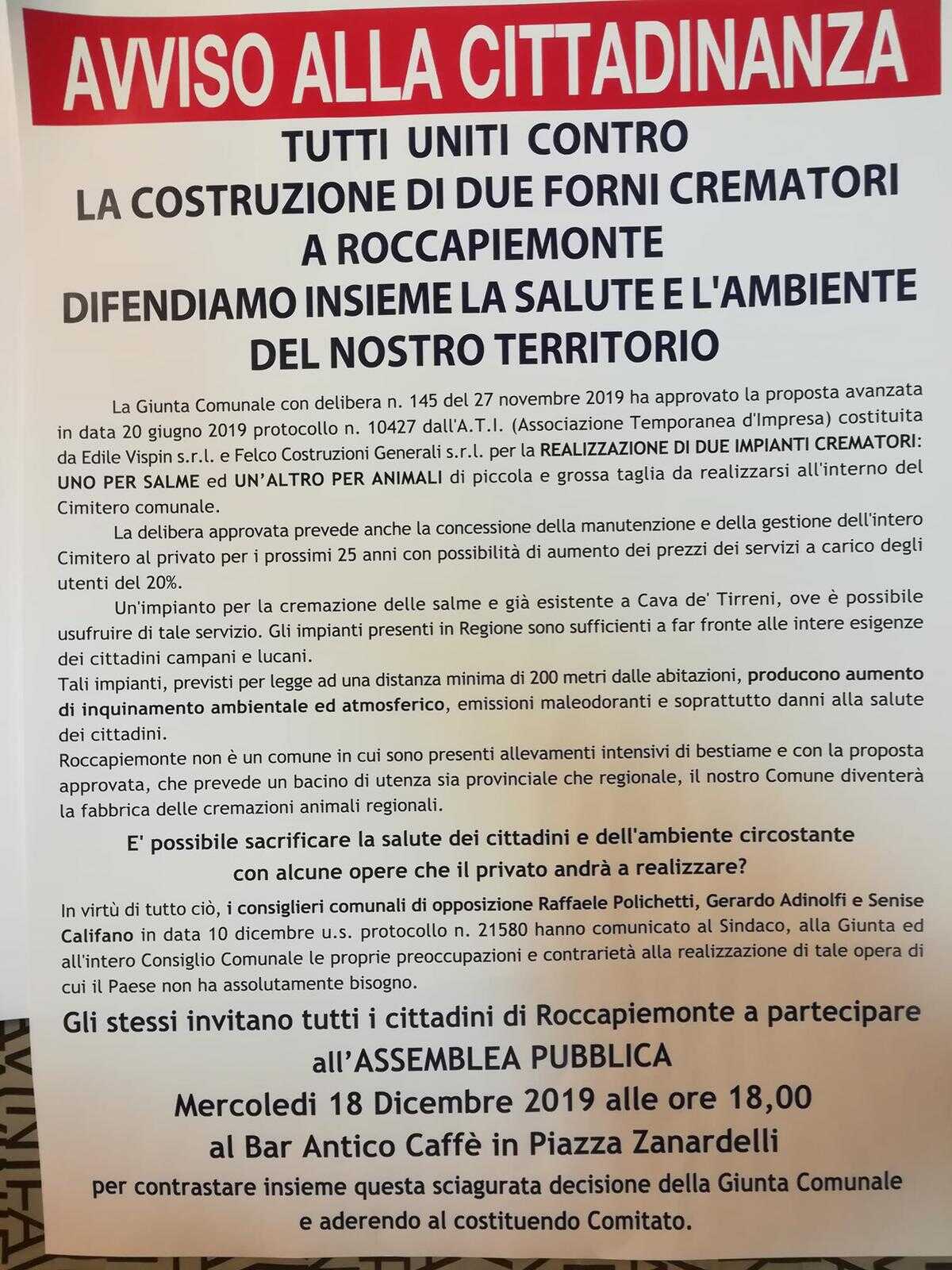 Dopo le prime polemiche scoppiate su fb e nelle piazze la popolazione inizia ad organizzarsi. Mercoledì 18 dicembre alle ore 18 presso l’Antico Caffè di Piazza Zanardelli ci sarà un’assemblea pubblica convocata dai consiglieri comunali di minoranza Raffaele Polichetti, Gerardo Adinolfi e Senise Califano per sensibilizzare la cittadinanza e per dare vita ad un Comitato No Forni Crematori a Roccapiemonte.