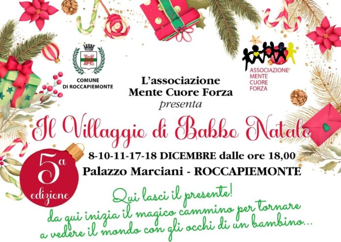 divertimento e addentrarsi nel clima delle feste. L’Associazione Mente Cuore Forza, presieduta da Tina Bove, con il patrocinio e l’appoggio del Comune di Roccapiemonte, la fattiva collaborazione dei Consiglieri Comunali Doriana Rescigno e Giuseppe Ciancio, organizza anche quest’anno eventi presso Palazzo Marciani. Si comincia l’8 dicembre dalle ore 18:00 con l’inaugurazione del “Villaggio di Babbo Natale”, giunto alla quinta edizione. Previsti giochi, spettacoli, mercatini natalizi, presepe, fiabe, la possibilità di visitare la casa di Babbo Natale e di lasciargli la letterina, ed il 5 gennaio prossimo si terrà l’estrazione della letterina che vincerà un fantastico premio. L’ingresso è gratuito. Non mancheranno stand gastronomici, con le tipicità natalizie. Gli appuntamenti nei giorni 8-10-11-17-18 dicembre, sempre dalle ore 18:00.