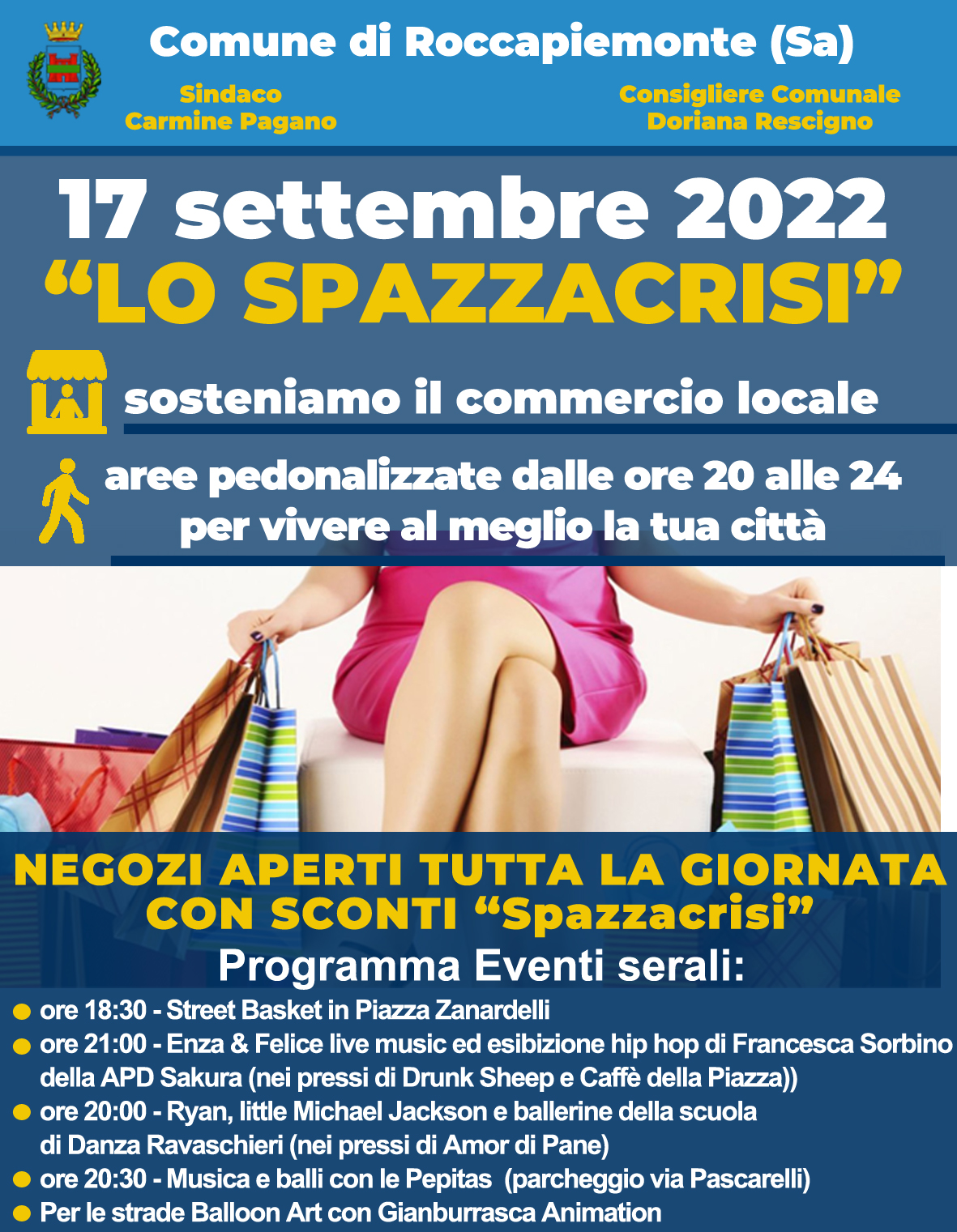 È tutto pronto per l’evento denominato “Lo Spazzacrisi” voluto dal Sindaco di Roccapiemonte Carmine Pagano e organizzato nei minimi dettagli dal Consigliere Comunale Doriana Rescigno, delegata al commercio e alla Consulta del Commercio di Roccapiemonte.
