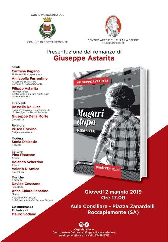 Il Sindaco Carmine Pagano e l’Assessore Annabella Ferrentino parteciperanno alla presentazione del romanzo di Giuseppe Astarita dal titolo “Magari dopo”. L’evento si terrà oggi alle ore 17:00 presso l’Aula Consiliare del Comune di Roccapiemonte. Previsti intermezzi musicali a cura di Davide Cesarano e Anna Chiara Sabatino, letture di Pina Pisacane, Rolando Schettino e Valerio D’Amico, oltre ad una estemporanea pittorica di Mauro Sodano.