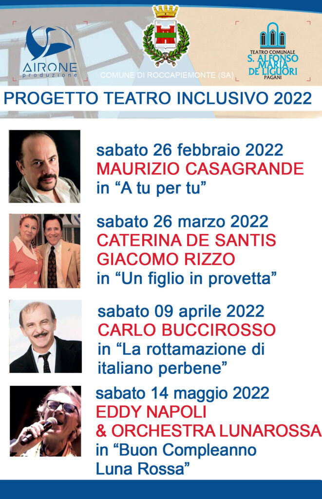 Anche quest’anno il Comune di Roccapiemonte aderisce al progetto “Teatro Inclusivo” che darà la possibilità ad 80 anziani residenti di partecipare agli spettacoli che si terranno presso l’Auditorium S.Alfonso di Pagani.