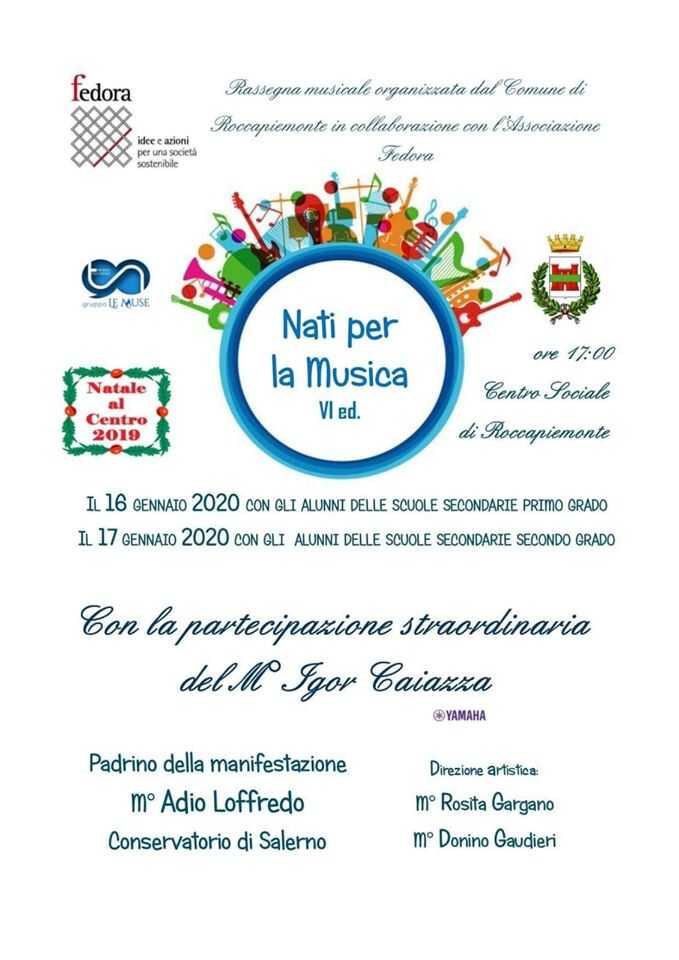 Torna la rassegna musicale “Nati per la musica” giunta alla 6a edizione, organizzata dal Comune di Roccapiemonte e curata dell’Associazione Fedora. Appuntamenti il 16 e 17 gennaio 2020 dalle ore 17:00 al Centro Sociale in via Fratellanza a Roccapiemonte.