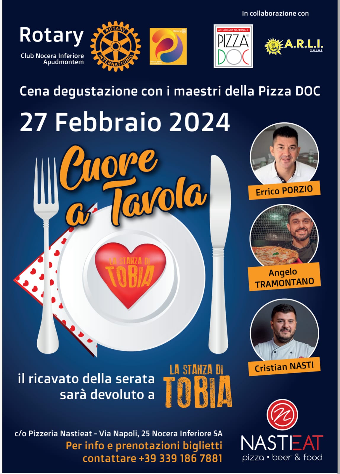 Questa sera alle ore 20 si dà spazio alla solidarietà, vera parola d’ordine per i 37 rotariani, con la cena di beneficenza «Cuore a tavola» al NastEat di Nocera Inferiore per aiutare i malati oncologici. L’evento nasce da un’idea del Rotary club Nocera Inferiore Apudmontem in collaborazione con l’Accademia nazionale pizza doc, il cui presidente è Antonio Giaccoli, punto di riferimento per chi vuole conoscere il mondo della pizza. I due gruppi sono uniti in questa cena benefica per fornire aiuti al progetto «La stanza di Tobia», realizzata dall’Accademia nazionale pizza doc e sostenuta dall’attività dell’Arli – Associazione regionale leucemie infantili – la cui finalità è fornire gratuitamente una casa per le famiglie di giovani pazienti ricoverati presso gli ospedali onco-ematologici del Sud Italia. Scendono in campo, in occasione della cena solidale, il pasticciere nocerino Onofrio Romano e i maestri pizzaioli Cristian Nasti, pizzaiolo e proprietario del ristorante e pizzeria NastEat, e i due volti noti dell’Accademia nazionale pizza doc: Errico Porzio, il pizzaiolo pop tra i più amati dal web, e Angelo Tramontano proprietario della pizzeria ’O Sarracin.