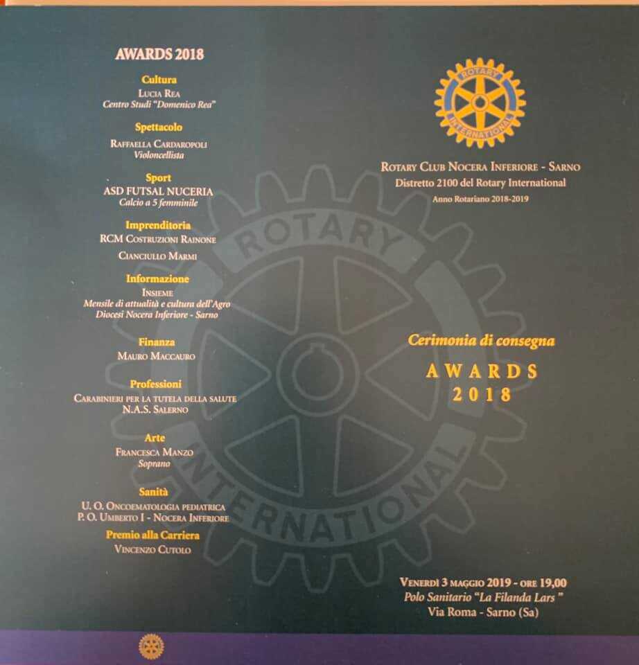 La cerimonia di consegna è fissata per venerdì 3 maggio alle 19,00 alla Filanda Lars di Sarno. Si tratta degli Awards 2018 che il Rotary Nocera Sarno attribuirà a varie personalità e realtà che si sono distinte in diversi campi. Lucia Rea per la Cultura, Raffaella Cardaropoli per lo spettacolo, Nuceria calcio a 5 per lo sport, Rainone e Cianciullo per l’imprenditoria, Insieme per il giornalismo, Mauro Maccauro per la finanza, i Nas di Salerno per le professioni, Francesca Manzo per l’arte, Oncologia Pediatrica Nocera per la Sanità. Il premio alla carriera è stato assegnato a Vincenzo Cutolo.