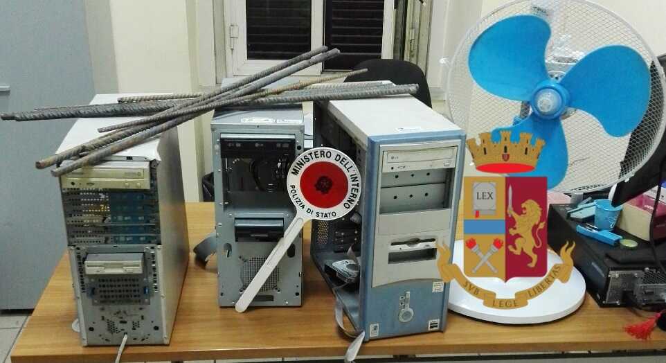 Appena giunti, gli agenti hanno notato una persona intenta a scavalcare il cancello carraio di un capannone. L’uomo, sorpreso a cavalcioni sull’inferriata, stava portando con se alcuni oggetti ed è stato subito bloccato. Dai successivi controlli è emerso che aveva già trafugato, sistemando su di una carrozzina, tre Personal Computer, un Ventilatore a piantana, diversi tondini di ferro. Il 26enne è stato condotto al carcere di Poggioreale.