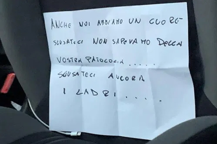 Incredibilmente la richiesta è andata a buon fine e i malviventi hanno riconsegnato la Fiat con tanto di biglietto di scuse: “Anche noi abbiamo un cuore. Scusateci non sapevamo della vostra patologia… Scusateci ancora…. I ladri”.