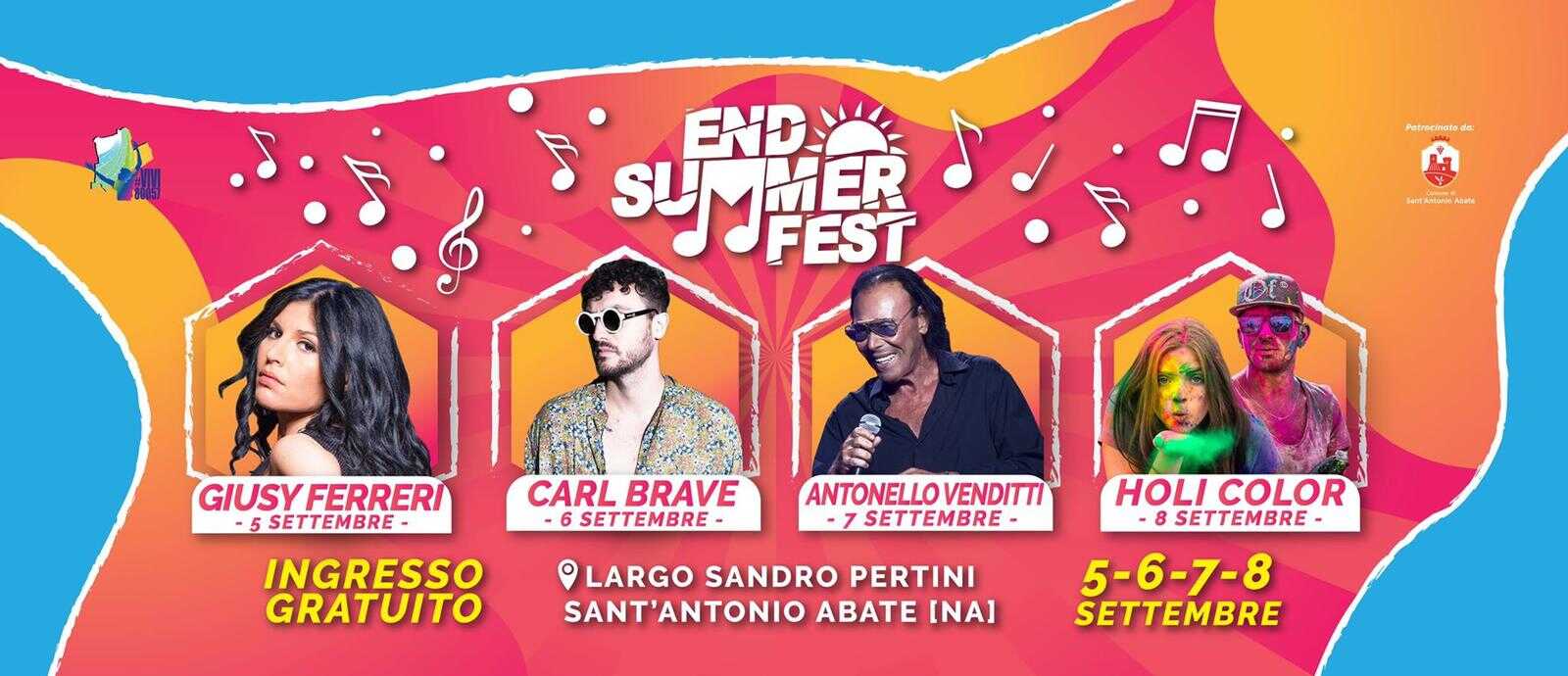 Torna a Sant’Antonio Abate (NA) per la sua terza edizione il festival musicale dal successo campano indiscusso. Organizzato dall’Associazione di Promozione Sociale #Vivi80057 dello stesso territorio abatese, l’ENDSUMMERfest ha voluto soddisfare l’alta aspettativa del suo pubblico stilando un programma di tre serate, dove ad esibirsi saranno i tre artisti da mesi in cima alle classifiche: Giusy Ferreri, Carl Brave ed Antonello Venditti con la sua unica data in Campania!