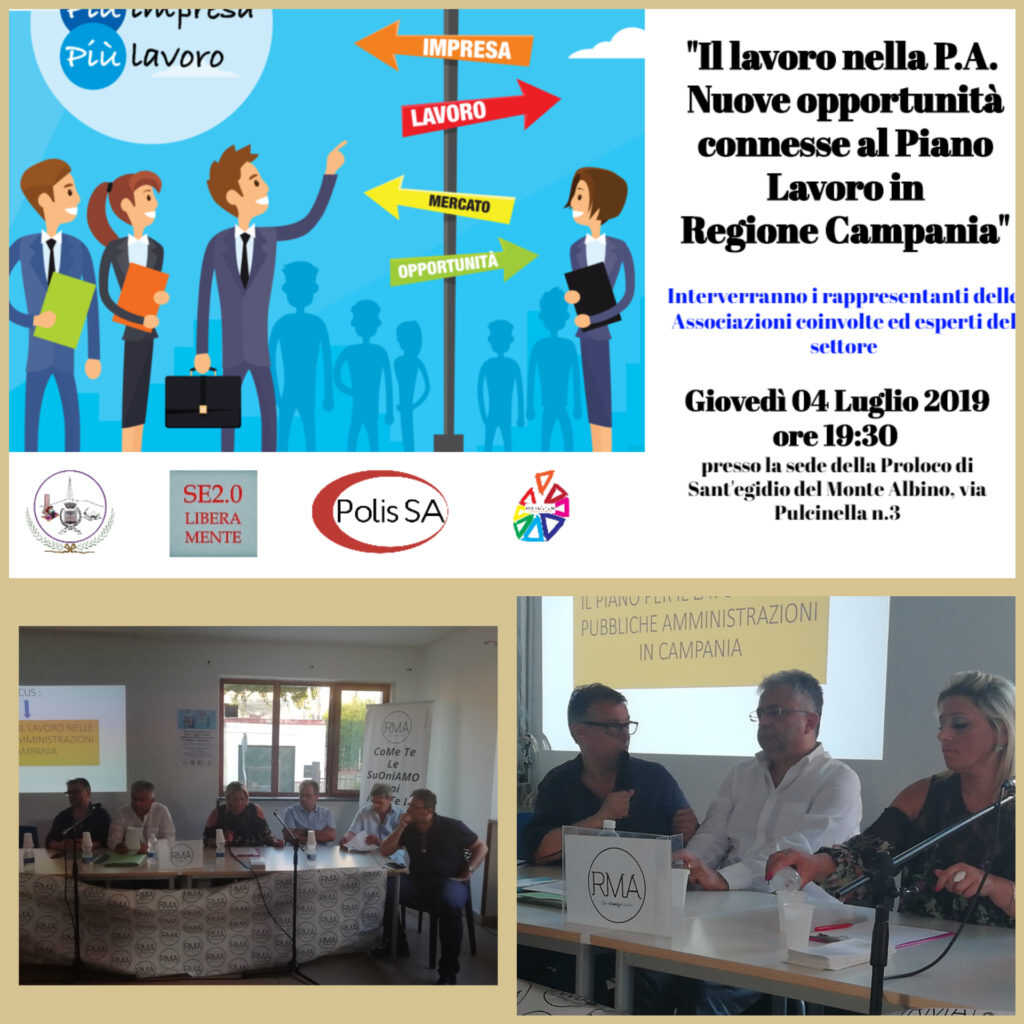 Giovedì 4 luglio, nei locai messi a disposizione dalla Pro Loco di Sant’Egidio del Monte Albino, si è tenuto l’incontro – convegno “Lavoro nella P.A. Nuove opportunità connesse al Piano Lavoro in Regione Campania“, organizzato dalle associazioni, Pro Loco Sant’Egidio Del Monte Albino, SE2.0 Libera Mente, Polis SA e Social Future.