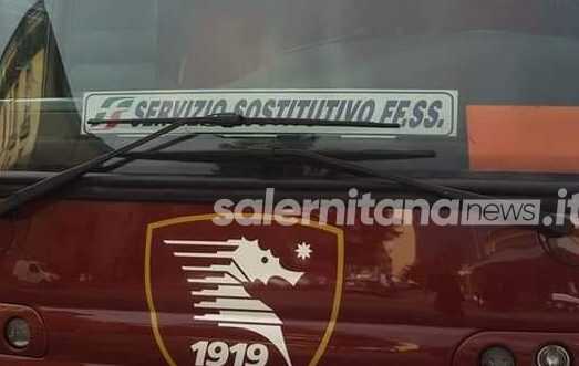 Stamattina il bus ufficiale del club di via Allende è stato riconosciuto da molti tifosi mentre era all’opera come servizio sostitutivo delle Ferrovie dello Stato per le strade di Salerno e provincia. “U.S. Salernitana 1919” ed il logo della società di trasporto ferroviario su un cartello esposto sul cruscotto del pullman. FOTO SALERNITANA NEWS