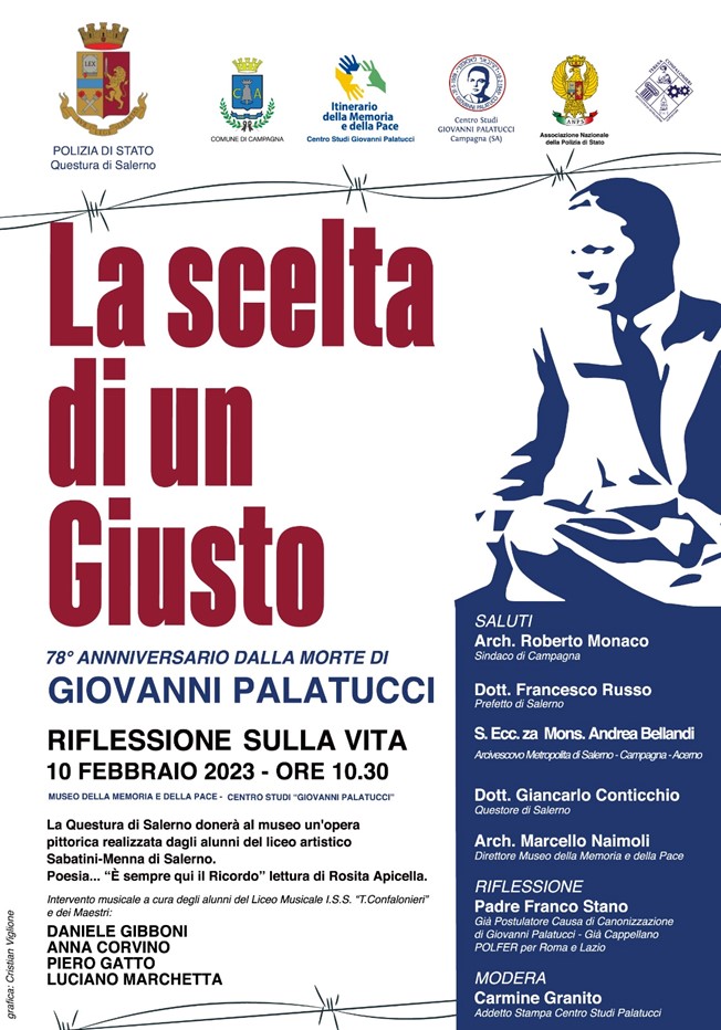 L’evento, che è si è potuto realizzare grazie alla collaborazione del Sindaco di Campagna e dell’Amministrazione comunale tutta, nonché del Centro Studi Giovanni Palatucci, attivo in quel Comune, si svolgerà alla presenza di una rappresentanza di studenti degli Istituti di Istruzione Superiore.