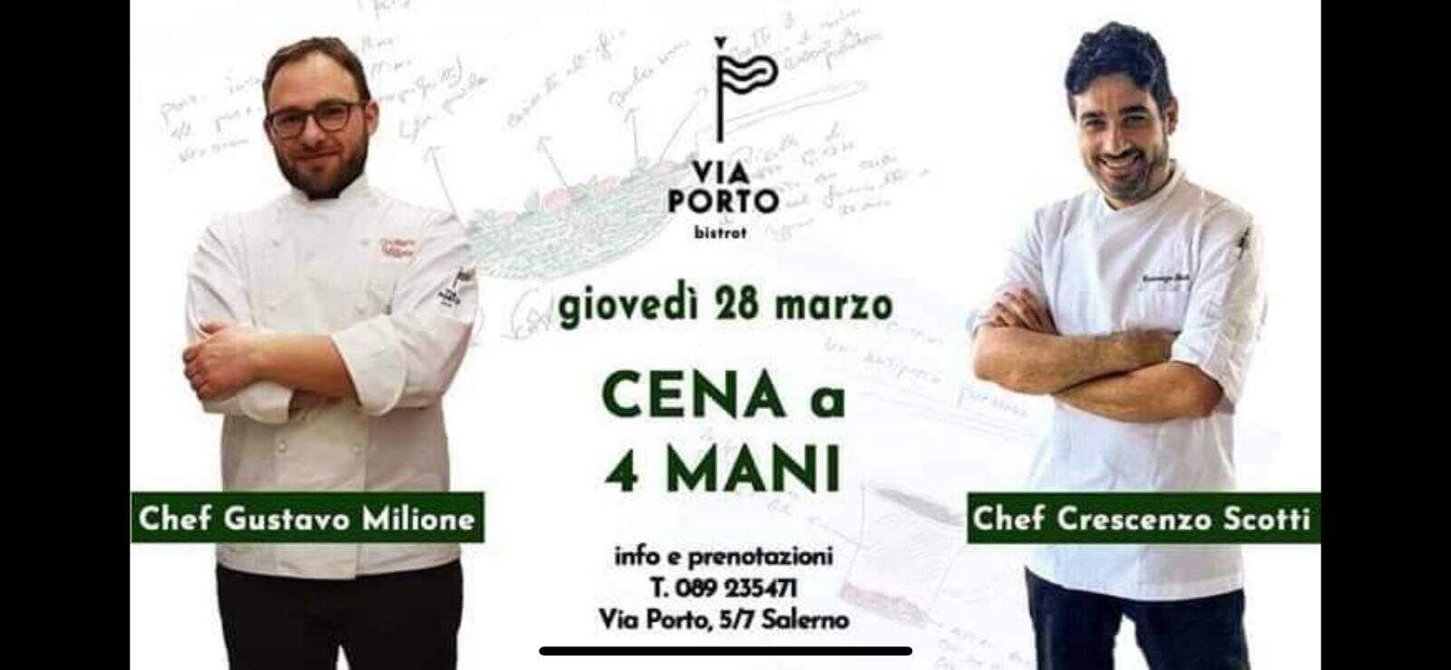 Gli chef, ovvero i cuochi, sin da ragazzini fanno una vita diversa… isolata, dove come amici, oltre alle padelle ed i fornelli, hanno i loro stessi colleghi.Ed è proprio all’insegna dell’amicizia e della buona cucina che stasera si terrà il 4mani tra Gustavo Milione, chef resident del ristorante “Via Porto Bistro”, ed Crescenzo Scotti, attuale chef del “Borgo Sant’Andrea” di Amalfi e già stella Michelin presso “Il Cappero” di Vulcano (ME). Col 4 mani di giovedì 28 il ristorante dei fratelli Mario e Rossella Salvati vuole dare inizio ad una serie di serate dove l’alta cucina, quelle delle stelle Michelin, arriverà a Salerno direttamente dalle cucine del loro ristorantino. “La mia intenzione –afferma determinato Mario Salvati– è quella di continuare ad offrire ai nostri clienti la possibilità di provare l’arte degli chef più importanti della Campania e non. Io e mia sorella abbiamo pensato –prosegue Mario- di arricchire una, due volte al mese l’offerta del nostro ristorante con delle serate a quattro mani, dove al nostro Gustavo affiancheremo un altro chef, in genere uno stellato”. Commosso è, invece, il commento di Milione che non sta più nei suoi panni. “Cucinare per una sera con un maestro come Crescenzo –esordisce lo chef di Via Porto- mi regala profonda gioia. Io non amo parlare –continua Gustavo Milione– ma devo dire che non posso che ringraziare la mia proprietà e quella del ‘Borgo Sant’Andrea di avermi regalato la possibilità di cucinare insieme con Crescenzo”. “La serata–interviene il già stellato Crescenzo Scotti– mi piace moltissimo in quanto mi è stata proposta da un amico che stimo.Non si tratterà del solito quattro mani, fidatevi noi ci divertiremo”.