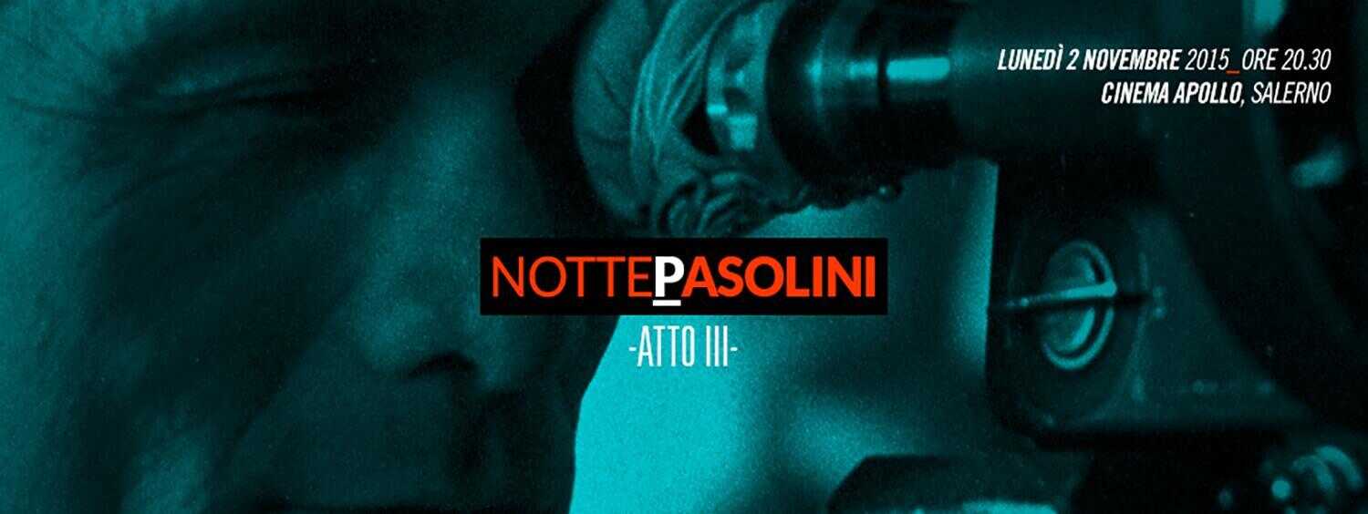 Salerno ricorda Pier Paolo Pasolini a quarant’anni dalla sua morte. E lo fa con il terzo atto della “nottepasolini” a cura di Alfonso Amendola (docente presso l’Ateneo di Salerno) in collaborazione con Luca Vaglia (direttore del Cinema Apollo). “Nottepasolini. Atto III” oltre ad essere l’unico omaggio dedicato a Pier Paolo Pasolini presente sul nostro territorio vede la collaborazione di una giovane squadra di esperti della comunicazione: Simona Castellano, Luca Lanzetta, Pina Meriano, Alfonso Maria Salzano e Giuseppe Volpicelli.