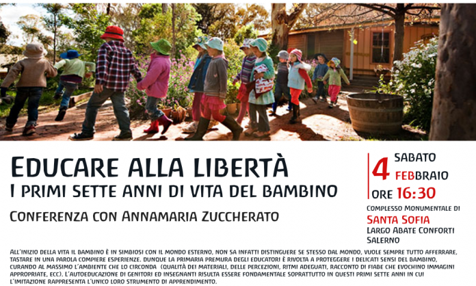 “Educare alla libertà. I primi sette anni di vita del bambino” è il titolo del convegno che si terrà sabato 4 febbraio e domenica 5 febbraio, presso il Complesso Monumentale di Santa Sofia, in Largo Abate Conforti a Salerno. Si tratta di un workshop di approfondimento sulla pedagogia steineriana con la maestra Annamaria Zuccherato, organizzato dall’Associazione “La nave di Namsen” con il patrocinio del Comune di Salerno-Assessorato alle Pari Opportunità. Educare i genitori e anche gli insegnanti è di fondamentale importanza per il bambino, soprattutto in questi primi anni di vita durante i quali l’imitazione è il loro principale metodo d’apprendimento.