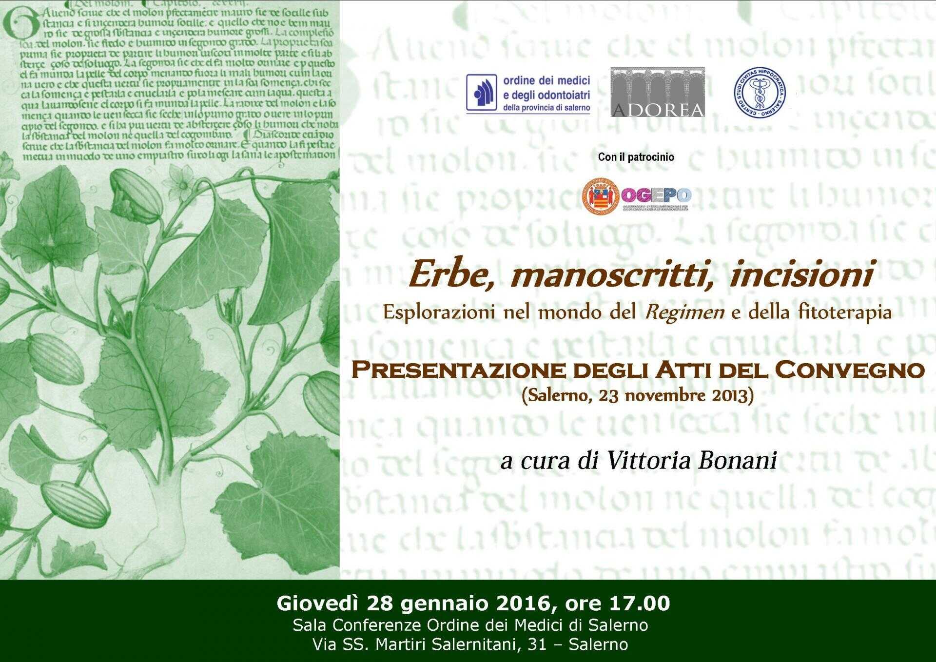 Giovedì 28 gennaio 2016, alle ore 17:00 presso la Sala Conferenze dell’Ordine dei Medici di Salerno, si terrà un incontro – organizzato dall’Ordine dei Medici e degli Odontoiatri della Provincia di Salerno, dall’Associazione ADOREA e dal Centro Studi Civitas Hippocratica Salerno, con il patrocinio OGEPO/UNISA – in occasione della presentazione degli Atti del Convegno “Erbe, manoscritti, incisioni. Esplorazioni nel mondo del Regimen e della fitoterapia“, a cura di Vittoria Bonani. Verrà analizzata, dal punto di vista storico, culturale e scientifico, l’eredità della Scuola Medica Salernitana. Un filo diretto che, da Trotula De Ruggiero, arriva fino alla cosmetica moderna, all’attuale sviluppo di nuovi farmaci tratti dalle piante, e alla ricerca condotta dal Dipartimento di Farmacia dell’Università di Salerno sull’utilizzo delle erbe nella scienza cosmetica.