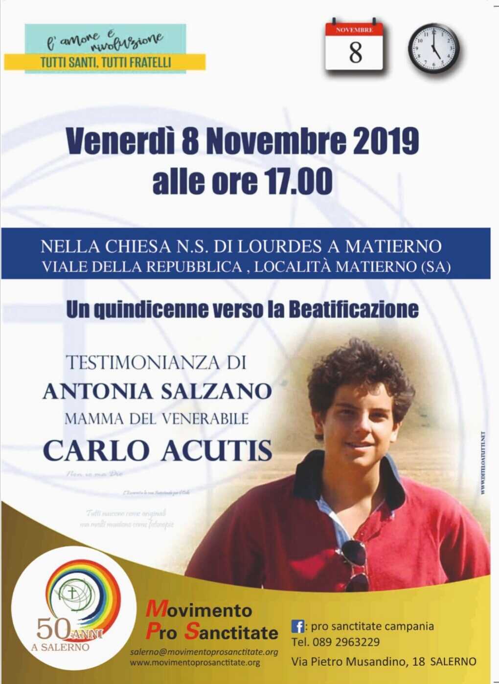 Continuiamo a celebrare il 50° anniversario della Pro Sanctitate a Salerno con una esperienza signifi- cativa nella periferia della nostra città: venerdì 8 novembre prossimo, alle ore 17.00, nella chiesa di Nostra signora di Lourdes a Matierno (SA), l’incontro-testimonianza con Antonia Salzano, la mamma del venerabile Carlo Acutis.