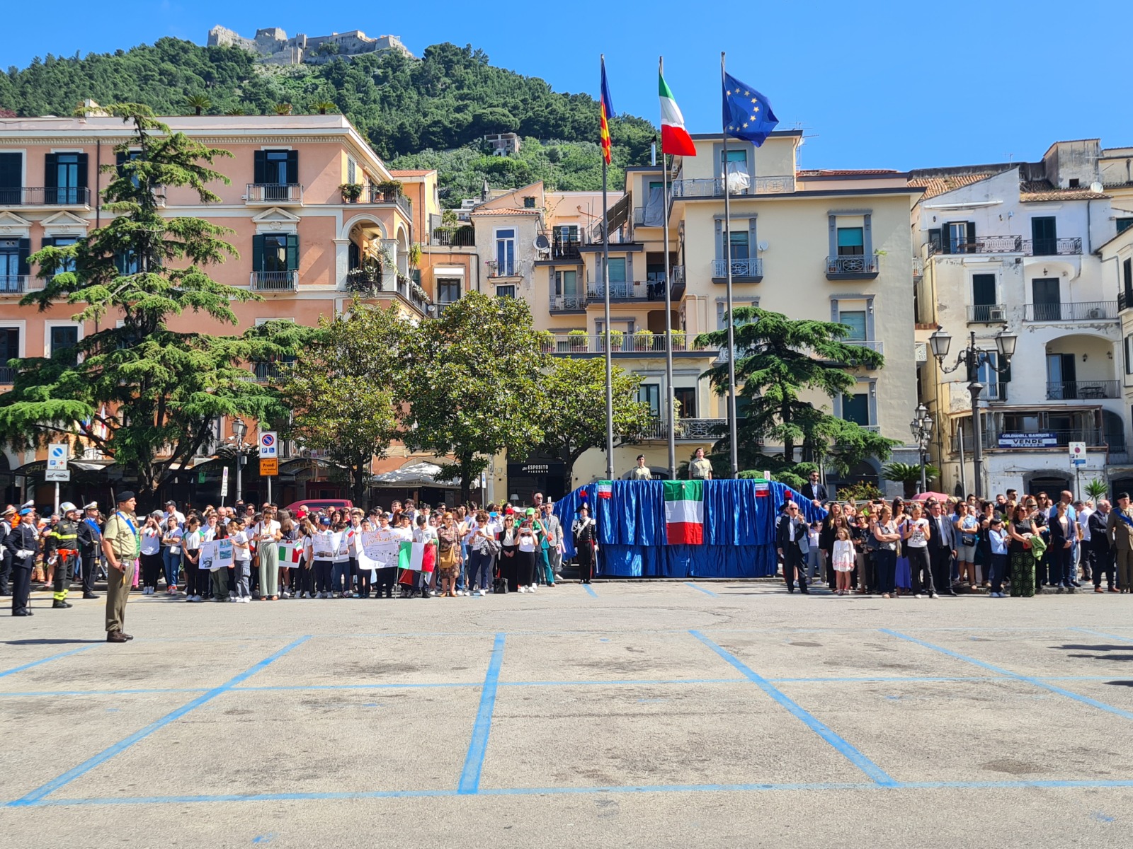 Le principali autorità civili, militari e religiose della provincia, riunitesi in piazza Giovanni Amendola a Salerno, hanno assistito all’Alzabandiera solenne sulle note dell’Inno d’Italia, eseguito dallo Storico Gran Complesso Bandistico “Città di Salerno” diretto dal maestro Rosario Barbarulo, che ha accompagnato tutta la solenne cerimonia con musiche dedicate alla Repubblica.