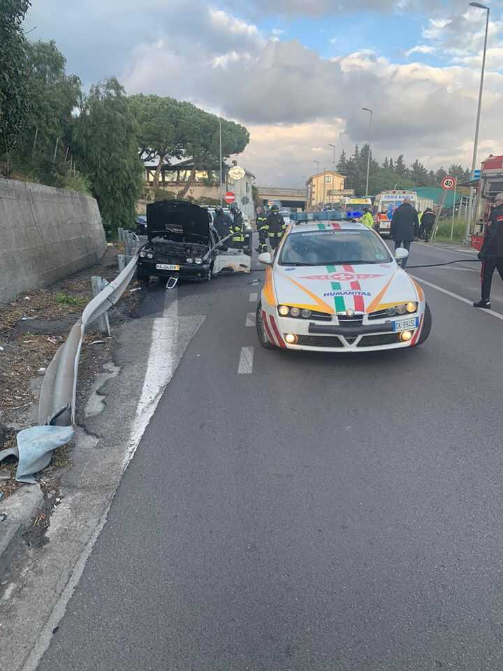 Attimi di tensione questo pomeriggio all’uscita della tangenziale dell’ospedale di Salerno in località San Leonardo. Ancora frammentarie le notizie che dicono che lì si sia concluso l’inseguimento di un uomo proveniente dal napoletano in trattamento sanitario obbligatorio. Sembra che questi nel tentativo di fuggire, proveniva da Pontecagnano, abbia perso il controllo dell’auto urtando contro un muretto, urto che con molta probabilità ha causato poi l’incendio della vettura che è andata completamente distrutta. Sul posto è stato necessario l’intervento dei vigili del fuocoe di mezzi del 118 con ambulanze dell’humanitas. Sembra nessuna conseguenza per l’autore del gesto che è stato preso prima preso in consegna dai carabinieri e poi affidato alle cure dei sanitari.