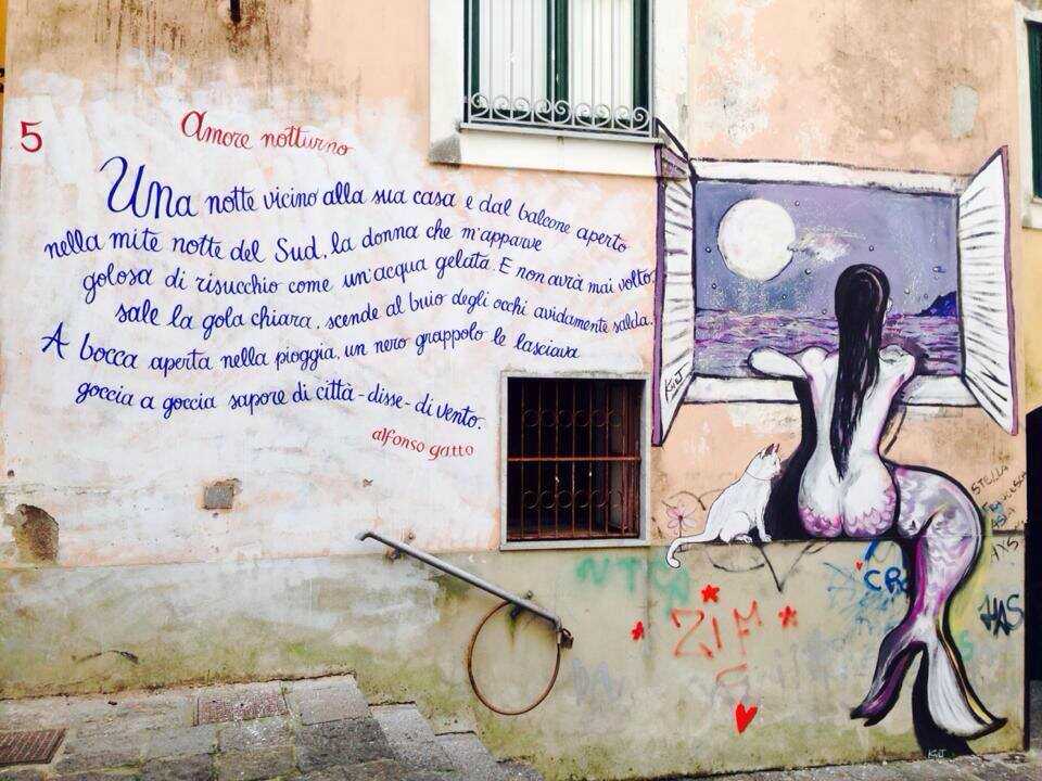 Veri e propri dipinti disegnati sui muri del quartiere Fornelle di Salerno. E’ la Street Art salernitana, che incontra però i versi di Alfonso Gatto, uno dei maggiori esponenti della cultura italiana del novecento. Non a caso, infatti, Gatto dediò quelli che sono i suoi versi più famosi alla sua città scrivendo: “Salerno, rima d’inverno, o dolcissimo inverno. Salerno rima d’eterno”. La città non dimentica ed omaggia con una serie di steet art a lui dedicate, non solo nel quartiere Fornelle ma anche in altre zone della città. Una piacevole passeggiata che riporta sulle orme di Alfonso Gatto.