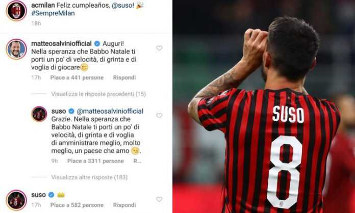 Botta e risposta piuttosto velenoso via social fra il leader della Lega, Matteo Salvini, e Suso, uno dei giocatori della sua squadra del cuore, il Milan. Al messaggio del club rossonero, che sul proprio profilo Instagram ha rivolto ieri gli auguri di buon compleanno all’attaccante spagnolo, Salvini ha aggiunto il proprio commento, accompagnato da una faccina che ammicca. “Auguri! – ha scritto l’ex ministro dell’Interno, che da tempo non lesina critiche al Milan – Nella speranza che Babbo Natale ti porti un po’ di velocita’, di grinta e di voglia di giocare”. Non si e’ fatta attendere la replica del fresco ventiseienne Suso, a sua volta seguita dall’emoji con un sorriso malizioso. “Grazie. Nella speranza – ha scritto lo spagnolo – che Babbo Natale ti porti un po’ di velocita’, di grinta e di voglia di amministrare meglio, molto meglio, un Paese che amo”.