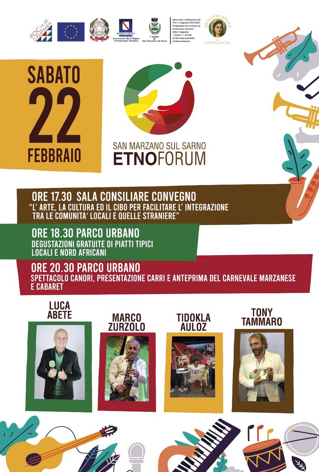 La giornata del 22 Febbraio sarà ricca di appuntamenti e di sorprese. Alle 17.30, presso la sala consiliare del Comune di San Marzano sul Sarno, si svolgerà il convegno sul tema “L’arte, la cultura e il cibo per facilitare l’integrazione tra le comunità locali e quelle straniere”.