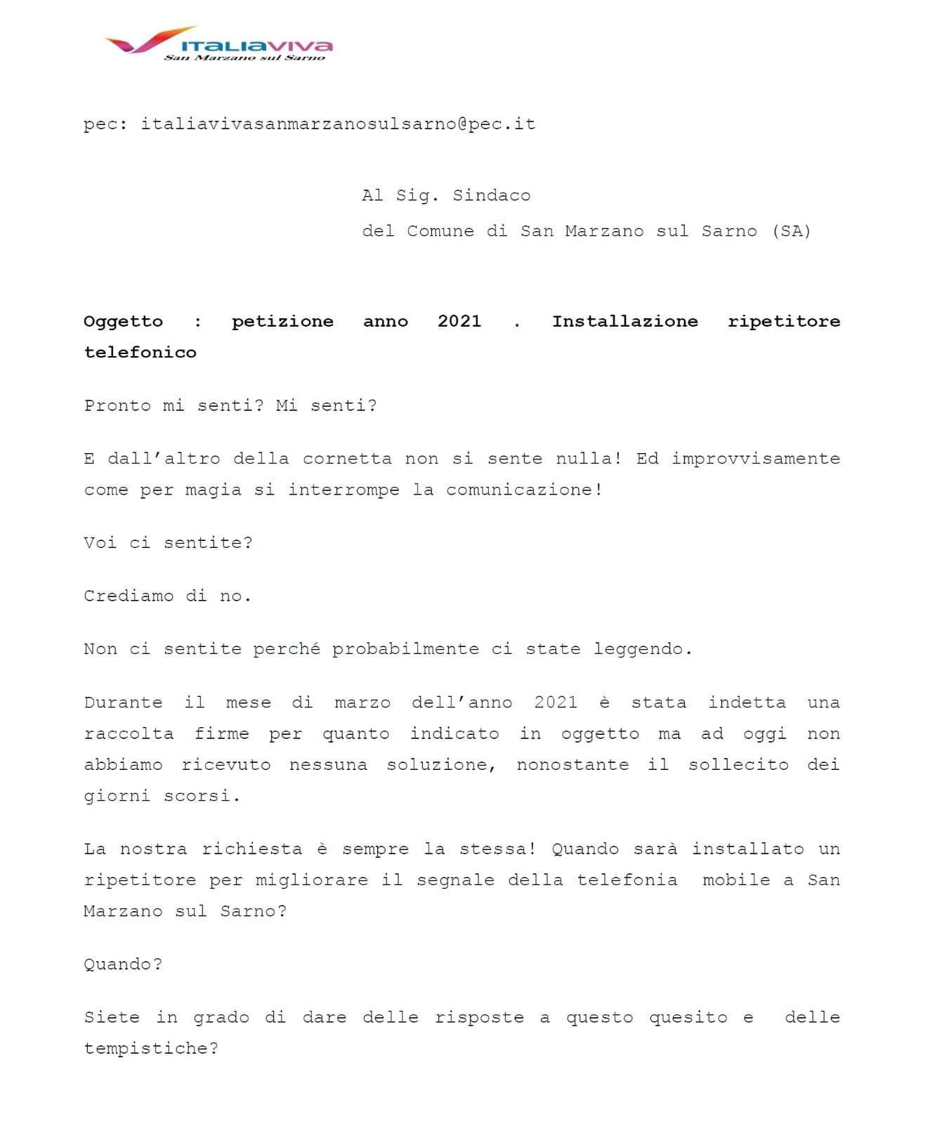 San Marzano sul Sarno. “Italia Viva” chiede l’ installazione ripetitore telefonico 5G