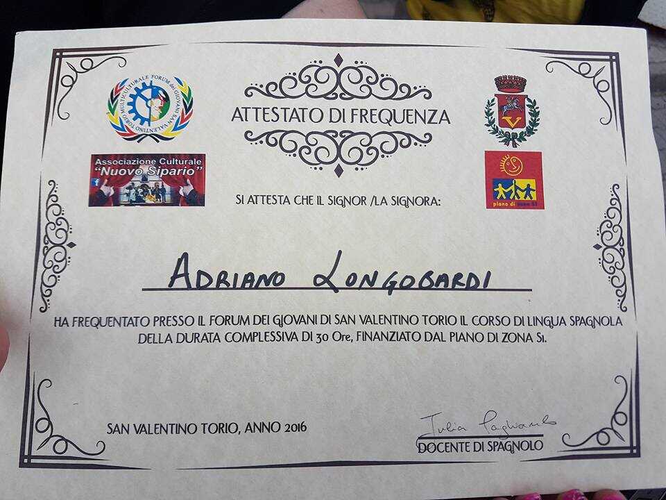 Sono stati 19 i giovani di San Valentino Torio a cui è stato consegnato l’attestato per il corso base di lingua spagnola organizzato egregiamente dal Forum dei Giovani nell’ambito delle attività del CAG (Centro di Aggregazione Giovanile) finanziate dal Comune e dal Piano di Zona S1. “Molti altri hanno frequentato il corso, ma con poca assiduità e dunque non hanno meritato l’ attestato – ha dichiarato il sindaco Strianese – Lo ha meritato, invece, il nostro caro amico Adriano Longobardi, che frequentava questo corso con impegno e passione per accrescere la sua “intercultura”, per conoscere altri luoghi ed altre persone. Ringrazio l’insegnante del Corso dott. ssa Julia Pagliarulo che me lo ha consegnato per renderlo poi alla famiglia.