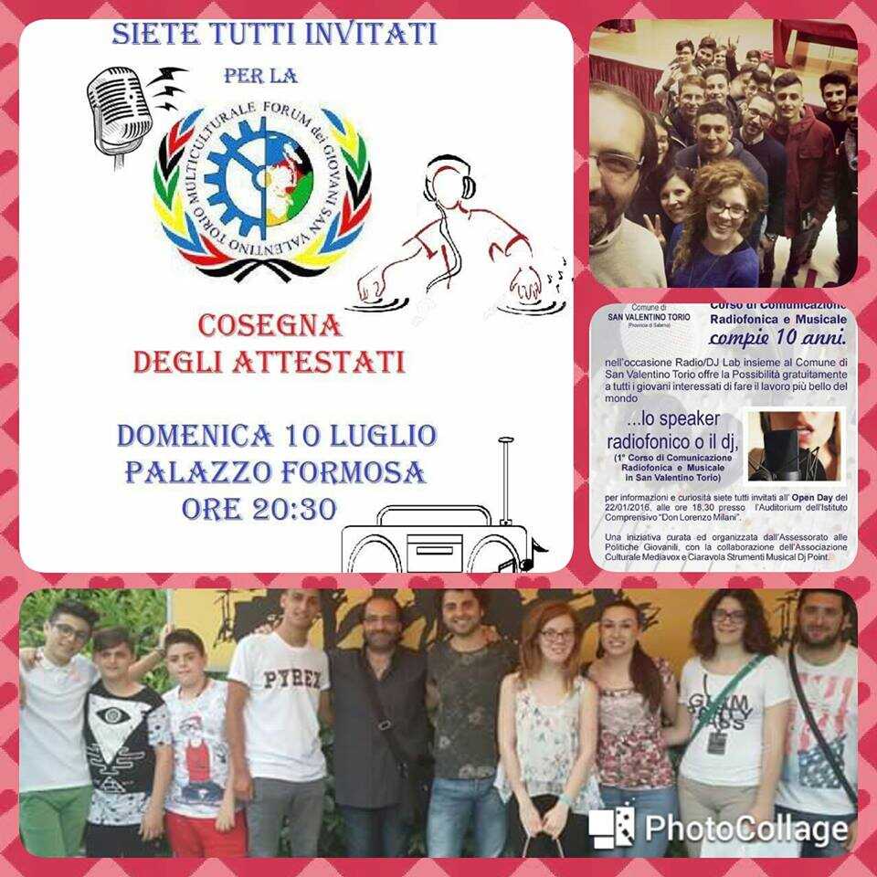Il Forum dei Giovani di San Valentino Torio, in collaborazione con l’Assessorato alle Politiche giovanili e l’Associazione culturale Mediavox, presenta l’evento conclusivo del Corso Radio DJ/Lab (corso di comunicazione radiofonica e musicale) con la consegna degli attestati. L’appuntamento è per domenica10 luglio alle ore 20:30 presso i giardini di Palazzo Formosa.