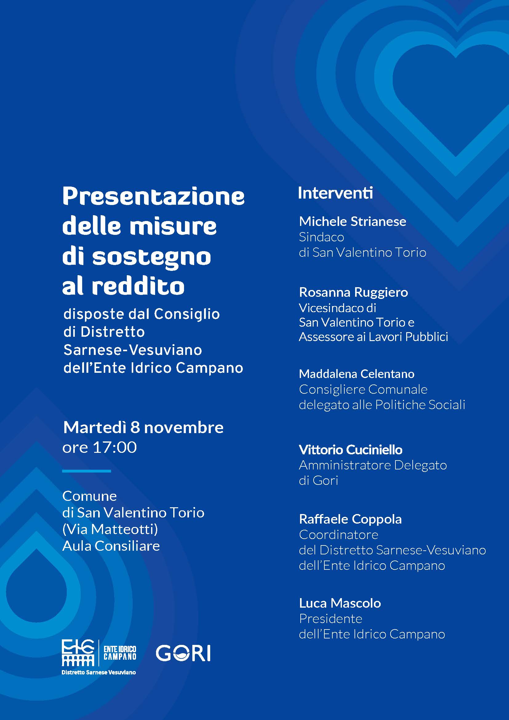 Martedì 8 novembre, alle ore 17:00, presso l’Aula Consiliare del Comune di San Valentino Torio (Via Matteotti), si svolgerà la conferenza stampa di Presentazione delle misure di sostegno al reddito disposte dal Consiglio di Distretto Sarnese-Vesuviano dell’Ente Idrico Campano.