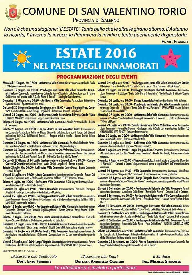R… Estate a San Valentino Torio. E’ questo l’invito che il sindaco Strianese ha rivolto alla cittadinanza. “Ecco il cartellone dell’estate, con tanti eventi di sport, spettacolo, intrattenimento. Cineforum, Festival della Pizza, Sagra della Birra e della Porchetta, Nello Iorio (Nonno Moderno) da Made in Sud, la Boxe di livello nazionale del nostro Gianluca Ceglia, la cena in bianco. E poi giochi per bambini, serate di discoteca per i giovani. Musica per i più anziani. Tornei sportivi, sfilate di moda e tanto altro – ha dichiarato il primo cittadino – Ringrazio profondamente l’Assessore allo Spettacolo Enzo Ferrante per l’ impegno profuso e l’Assessore Antonella Caldiero che ha collaborato alla redazione di un ottimo cartellone di eventi”.