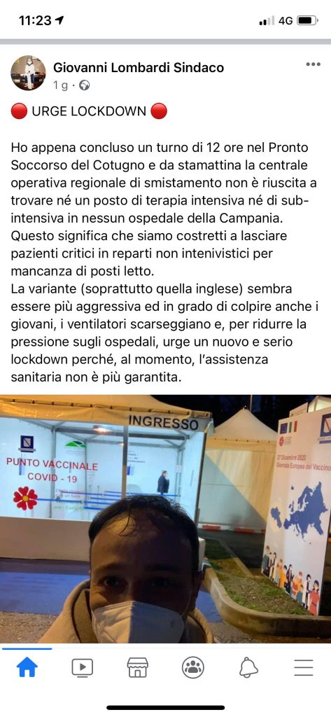 “Urge un nuovo e serio lockdown perché, al momento, l’assistenza sanitaria non è più garantita”. Lo ha scritto nella tarda serata di giovedì sera in un post su Facebook il sindaco di Calvi Risorta, Giovanni Lombardi, medico anestesista-rianimatore dell’Azienda ospedaliera dei Colli di Napoli.