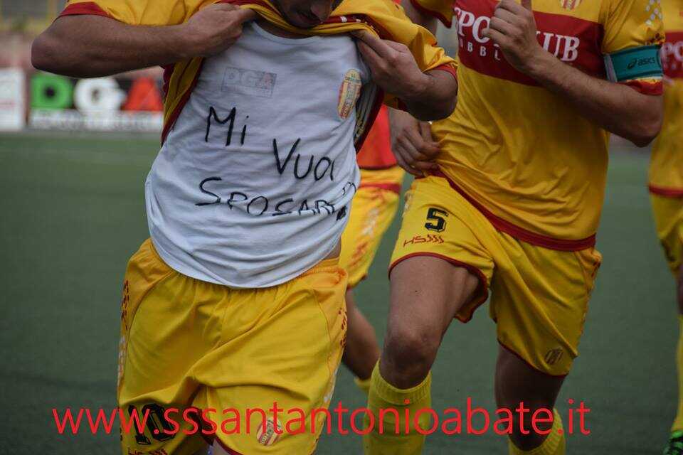 Oggi pomeriggio il Sant’Antonio Abate ha battuto il San Tommaso 2-0 in un importantissimo scontro salvezza, ma l’azione più emozionante della partita è stata registata al termine dei 90 minuti, quando Lino Siciliano – autore di uno dei due goal – è salito sugli spalti e, con la scritta “mi vuoi sposare?” sulla maglietta e un anello tra le mani, ha fatto la proposta di matrimonio alla sua compagna Tonia, in dolce attesa. Il video è diventato immediatamente virale sul web e ha collezionato già svariate condivisioni e tantissimi commenti.