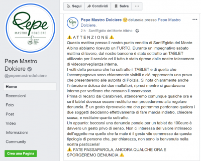 “Questa mattina presso il nostro punto vendita di Sant’Egidio del Monte Albino abbiamo ricevuto un FURTO. Durante un impegnativo sabato mattina di lavoro, dal nostro bancone è stato sottratto un TABLET utilizzato per il servizio ed il tutto è stato ripreso dalle nostre telecamere di videosorveglianza interna.