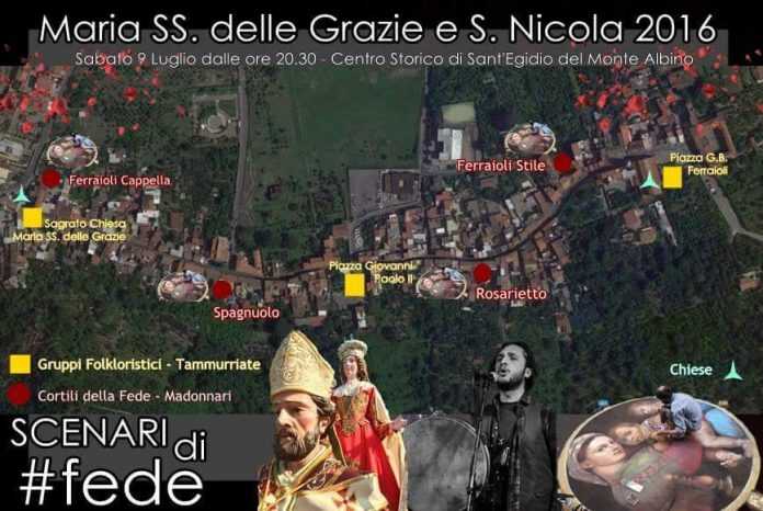 La Festa della tradizione in onore di Maria SS. Delle Grazie e S. Nicola da Bari, Patrono della città di Sant’Egidio del Monte Albino, continua ed entra nel vivo in attesa della processione che sfilerà domenica 10 luglio per il centro storico. Nelle scorse serate il paese è stato allietato da sfilate di moda, spazi letterari ed eventi teatrali a cura dei giovani del luogo e dal comitato festeggiamenti #fedeliallatradizione. Sabato 9 andrà in scena “Scenari di Fede. Incontro tra culture”, un’iniziativa che vede coinvolti i madonnari del Concorso nazionale di Nocera Superiore e il ritmo delle tammorre capitanate dal paganese Vincenzo Romano. Alle 24.00 Vincenzo Romano, il cantore pellegrino della tradizione e simbolo della festa della Madonna delle Galline, eseguirà il tradizionale canto devozionale alla Madonna. In occasione della festa si esibiranno anche altri gruppi folkloristici, quello irpino-cilentano dei Tammurriarè in Piazza Giovanni Paolo, poi quello vesuviano Fiumi di lava sul sagrato della Chiesa Maria SS. delle Grazie. Presenti anche alcuni gruppi di danza: Compagnia UHANEMA (Valle del Sarno, Pagani); Associazione Arcobaleno (Angri); Gruppo di danze popolari Terranuda di Asd Lithodora Sport. Non solo musica, arte e fede, ma anche degustazione di prodotti gastronomici locali. Tra le piazze e i cortili di Sant’Egidio sarà una serata da non perdere all’insegna della tradizione.