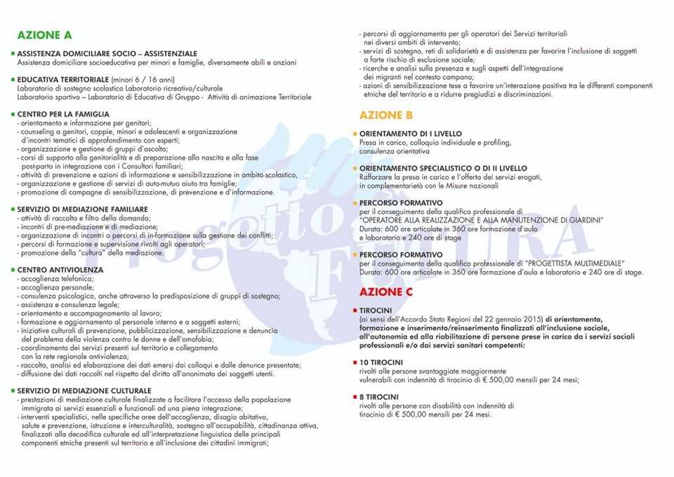 Sono partite le prime attività del Progetto Futura, nell’ambito del Programma ITIA – Intese territoriali di inclusione attiva. Si tratta di un importante e articolato progetto, coordinato dall’Ambito Territoriale S01_2, che prevede 3 azioni, ciascuna con una serie di obiettivi specifici. L’obiettivo generale dell’intervento è quello di potenziare e rafforzare la rete dei servizi sociali territoriali. Nella grafica qui sotto, troverete tutte le azioni e gli interventi previsti. Sono stati pubblicati i primi due bandi rivolti ai potenziali destinatari.