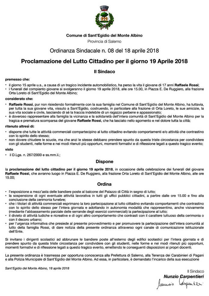 Il sindaco Nunzio Carpentieri ha proclamato per oggi il lutto cittadino, cosicché l’intera comunità possa stringersi intorno alla famiglia di Raffaele. Qui di seguito l’ordinanza del sindaco.