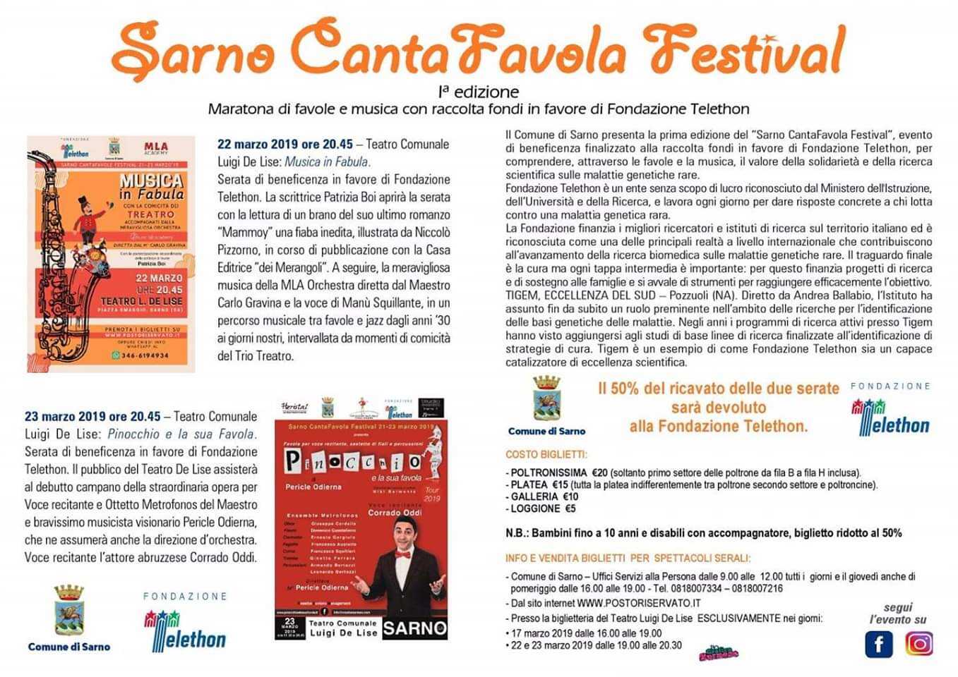 Nei giorni 21, 22 e 23 marzo 2019 si svolgerà presso il Teatro Comunale Luigi DeLise la prima edizione del “Sarno CantaFavola Festival”, evento che, attraverso le favole e la musica, vuole far comprendere il valore della solidarietà e della ricerca scientifica di malattie genetiche rare.