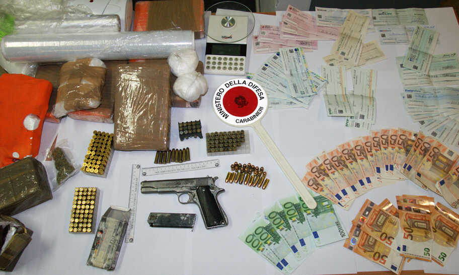 I militari hanno fatto irruzione nell’abitazione dell’uomo dove, guidati dal fiuto del cane antidroga Gero, hanno rinvenuto 7,5 kg di cocaina, 2 kg di hashish, 50 grammi di marijuana oltre ad una pistola Colt calibro 9 priva di matricola, circa 200 cartucce di vario calibro e la somma di 20mila euro tra contanti e titoli al portatore.