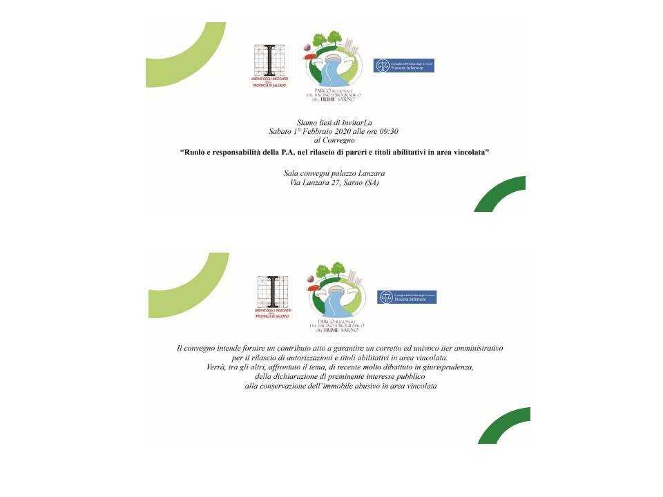 Il Convegno odierno intende fornire un contributo atto a garantire un corretto ed univoco iter amministrativo per il rilascio di autorizzazioni e titoli abilitativi in area vincolata. Al centro il tema, di recente molto dibattuto in giurisprudenza, della dichiarazione di preminente interesse pubblico alla conservazione dell’immobile abusivo in area vincolata. Il Convegno, dopo i saluti di Vincenzo Ascione (Presidente della Comunità dei Sindaci del Parco Regionale del Bacino Idrografico del fiume Sarno, del Colonnello Maria Gabriella Martino (Comandante Gruppo Carabinieri Forestale Salerno) e di Giuseppe Canfora (Sindaco del Comune di Sarno) ha aperto i lavori con un intervento del Presidente dell’Ordine degli Ingegneri della provincia di Salerno Michele Brigante, del Presidente del Consiglio dell’Ordine degli Avvocati di Nocera Inferiore Guido Casalino. Nel prosieguo dei lavori, i seguenti interventi: