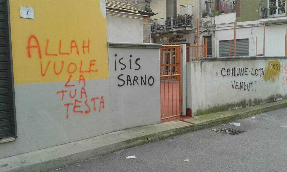 A Sarno la scoperta fatta questa mattina non ha destato grande scalpore, in considerazione di quanto già avvenuto in passato. Mesi scorsi, le stesse scritte erano comparse su altri muri. Non dimenticando poi l’anomala riproduzione di una bandiera dello Stato Islamico (conosciuto come Isis) piazzata nei pressi degli uffici del giudice di pace. Una bandiera artigianale, composta in malo modo, con errori commessi persino nella scritta che poi caratterizza la bandiera stessa (è la testimonianza di fede principio massimo del Corano, se qualcuno non lo sapesse ancora. Autori compresi). Le indagini dei carabinieri dunque ritornano nuovamente a svilupparsi su questi atti vandalici, con la speranza di individuare quanto prima gli autori.