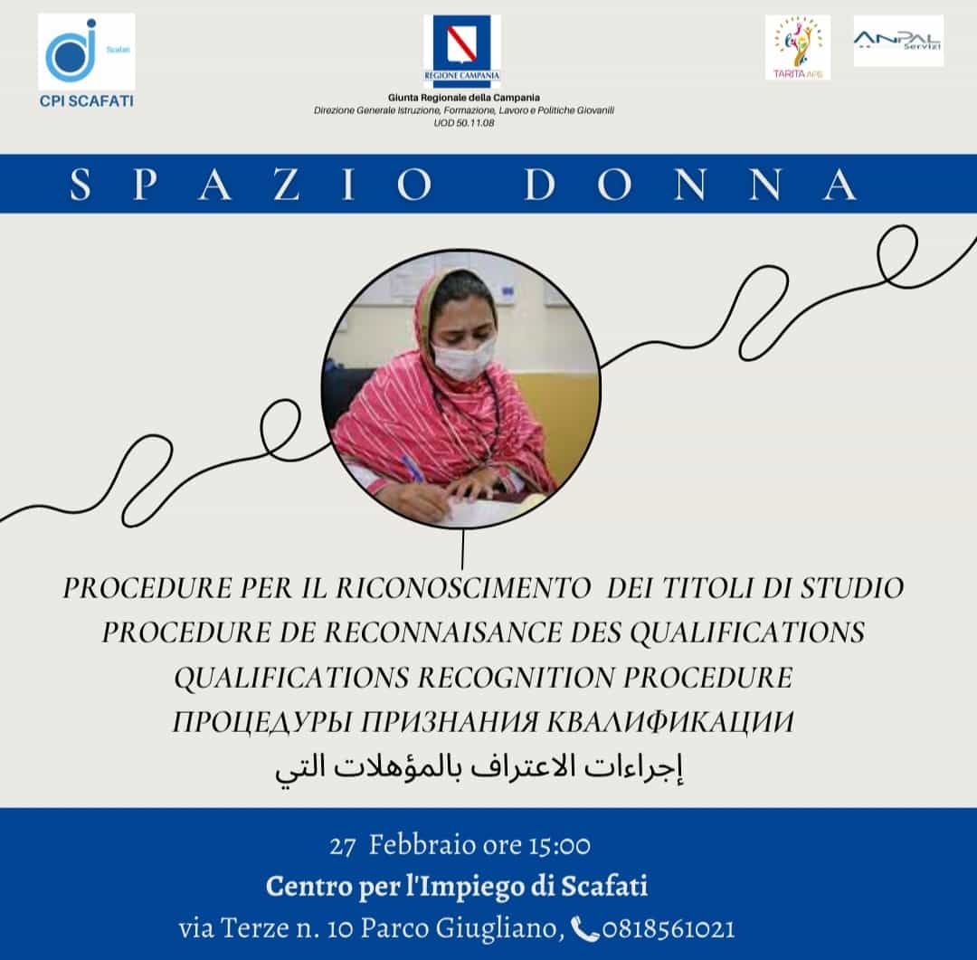 CPI SCAFATI Spazio Donna – TARITA APS immigrant women are invited to participate in the presentation of the procedures for the recognition of the qualification obtained in non-EU countries.