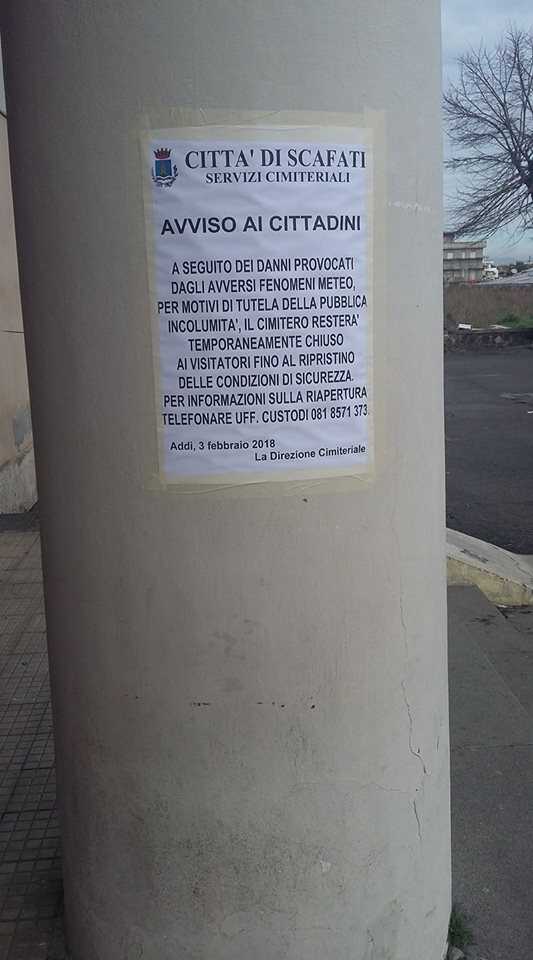 Su Facebook scatta la protesta degli scafatesi che vorrebbero visitare i defunti e che invece non possono farlo. Ecco il commento che sintetizza tutto ” Sono amareggiata, non si è mai visto un cartello cosi, non è possibile sono incredula, perché sono caduti degli alberi si dice. Ribelliamoci al vietarci di andare al cimitero, porte chiuse già da due giorni, ma dove siamo arrivati”.
