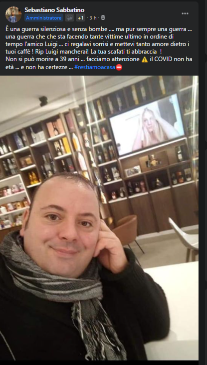 È una guerra silenziosa e senza bombe …. ma pur sempre una guerra … una guerra che che sta facendo tante vittime ultimo in ordine di tempo l’amico Luigi … ci regalavi sorrisi e mettevi tanto amore dietro i tuoi caffè ! Rip Luigi mancherai! La tua scafati ti abbraccia !Non si può morire a 39 anni … facciamo attenzione il COVID non ha età … e non ha certezze … #restiamoacasa