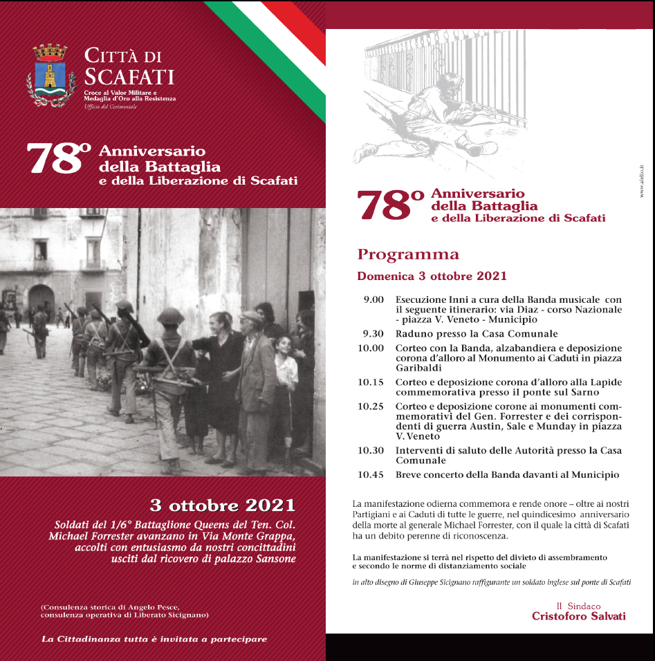 che, con grande coraggio, contribuirono alla liberazione di Scafati, in ausilio alle truppe inglesi, che faceva- no parte dello schieramento alleato. E’ importante mantenere vivo il ricordo di quel sacrificio, di quella giornata, di quella battaglia per l’esempio di coraggio, di spirito di sacrificio e di alto senso del dovere offerto da tutti coloro che furono coinvolti nel combattimento, senza distinzione di grado e di origine. Ci auguriamo che alla cerimonia siano presenti anche gli studenti delle nostre scuole. Credo sia importante costruire un percorso di condivisione della memoria, in particolar modo tra i giovani, affinché conoscano la storia della nostra città ed imparino a comprendere il significato più profondo di quel sacrificio”.