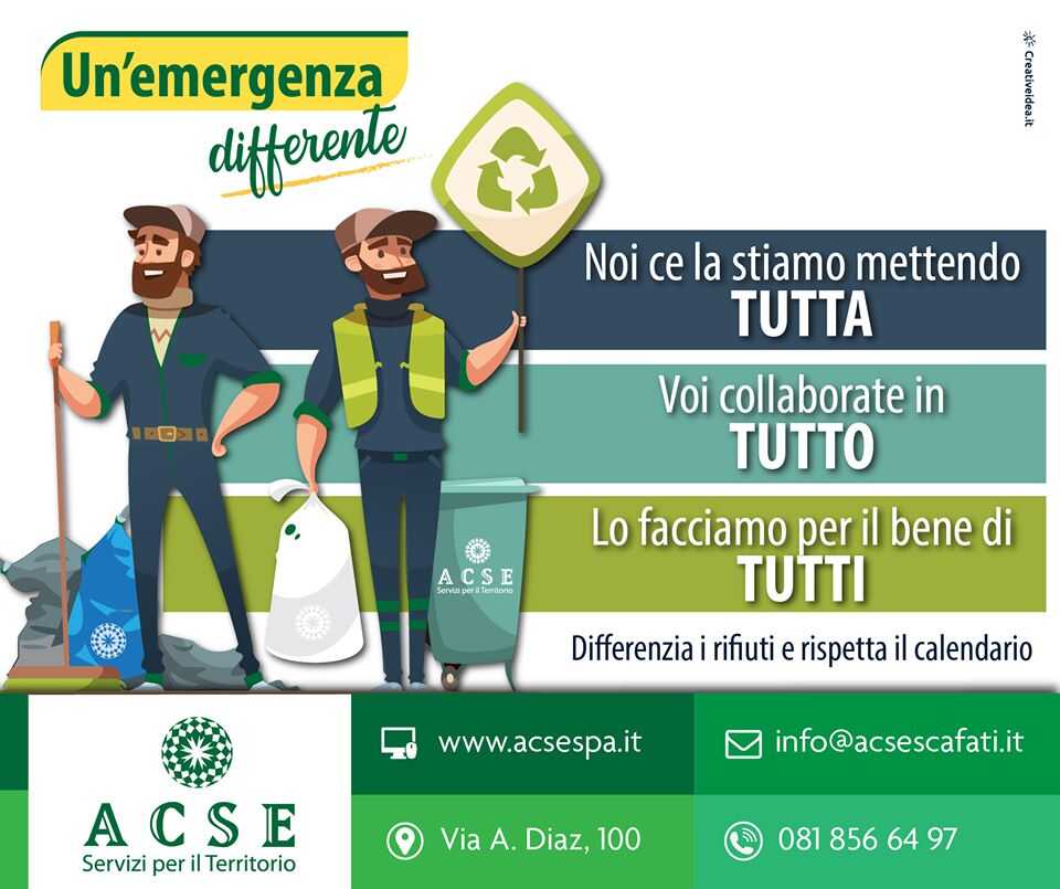 L’azienda comunale dei servizi esterni ACSE S.p.A., in questo particolare periodo, è in prima linea chiamata a garantire la pulizia ed il decoro soprattutto da un punta di vista sanitario. Proprio in questo senso, l’azienda ha suddiviso il giro di raccolta della differenziata.