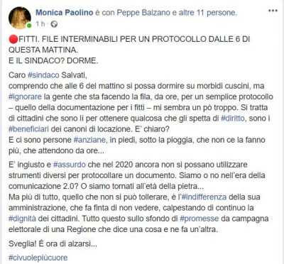 Lunghe file al Comune di Scafati per protocollare la richiesta per il contributo fitti. Non manca la polemica politica. Monica Paolino, recentemente querelata dal sindaco Cristoforo Salvati, suona la sveglia al primo cittadino. La consigliera regionale ha sollecitato Salvati ad intervenire. Alla base del post della dottoressa Paolino la lunga fila alla quale si stanno sottoponendo gli utenti, in un giorno in cui le condizioni climatiche non sono ottimali. La stessa evidenzia come al Comune di Scafati la tecnologia resti una sconosciuta.