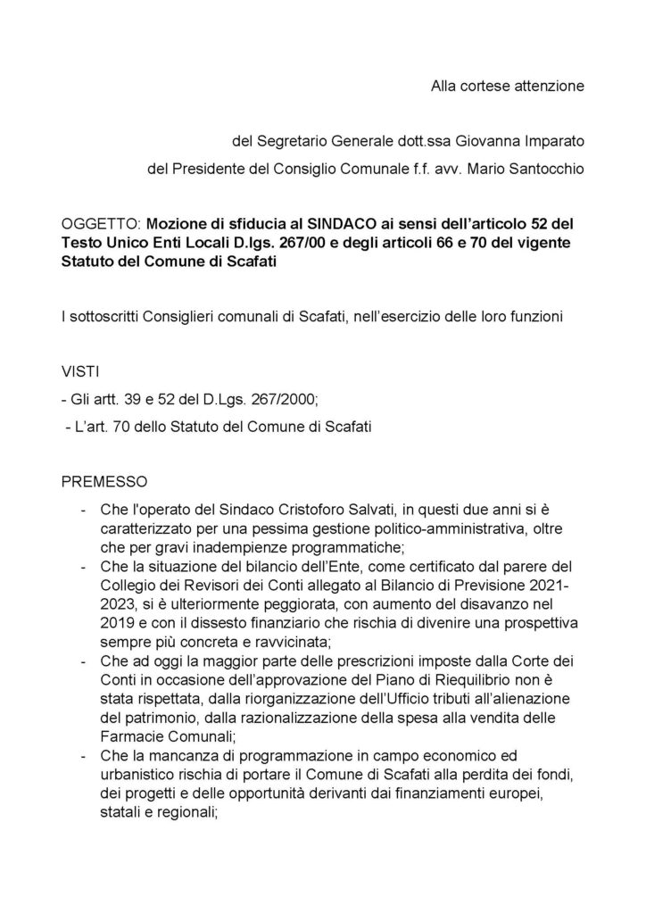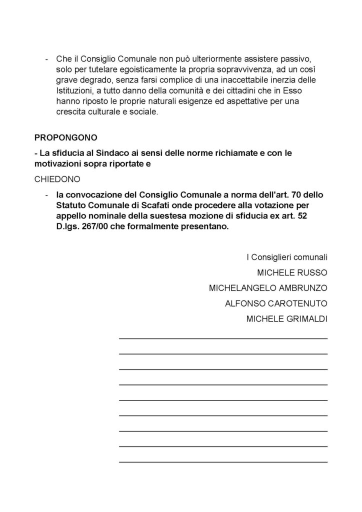 Il gruppo consiliare “Insieme per Scafati” ha inviato un documento dove è stato sottoscritto da Michele Russo, Michelangelo Ambrunzo, Alfonso Carotenuto e Michele Grimaldi per la mozione di sfiducia per Cristoforo Salvati